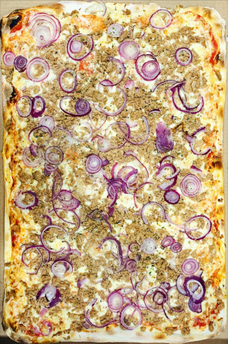 mit Thunfisch, Tomatensoße, Käse, Oregano & Zwiebeln.