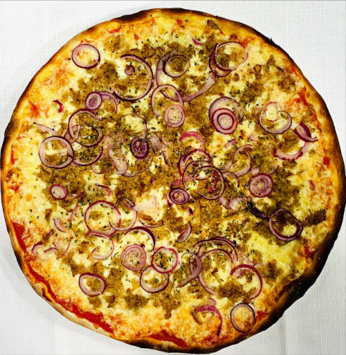 mit Würzigem Hackfleisch, Zwiebeln. Käse, Tomatensoße Oregano & Mozzarella.