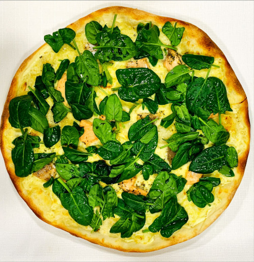 mit frischem Blattspinat, Käse, Oregano, Lachs & Creme Fraiche.