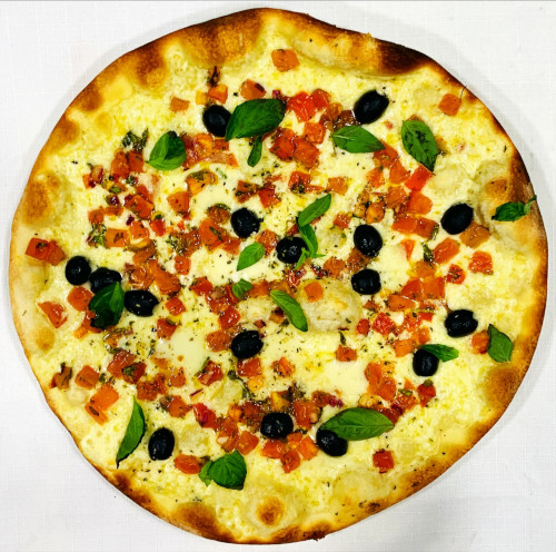 mit Olivenöl, Bruschetta, Tomaten, Käse, Oregano Mozzarella, Oliven & Basilikum.