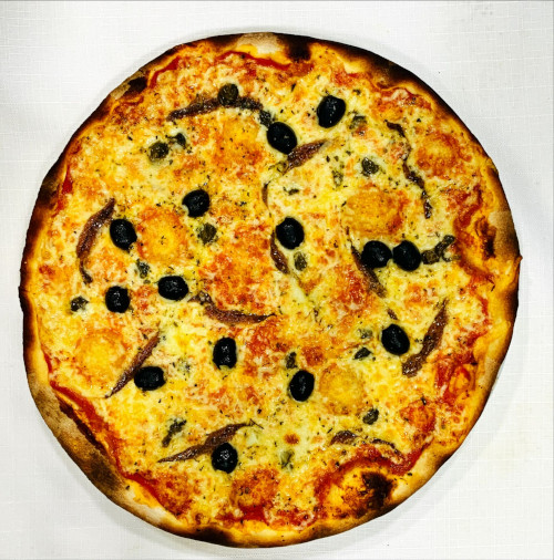 mit Sardellen, Kapern, Käse, Tomatensauce, Oregano & Oliven.